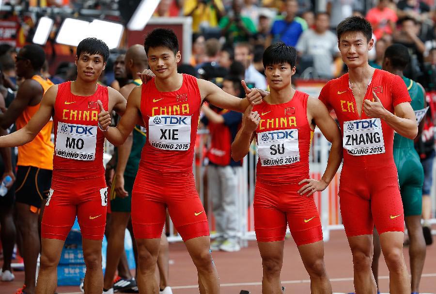中国队在2015田径世锦赛男子4×100米接力决赛后合影(左一为莫有雪,右二为苏炳添)