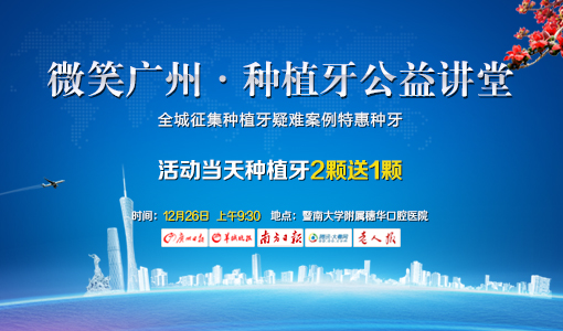 12月26号,穗华口腔医院联合南方日报等媒体举办微笑广州·种植牙公益讲堂,届时种植牙公益讲堂还邀请穗华口腔医院院长赖仁发教授与缺牙患者一起分享种植牙如何种才更安全,同时面向全城征集种植牙疑难案例,享受特惠种牙。
