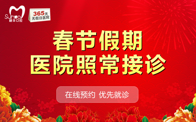 穗华口腔医院已实行全年365天无假日”医疗政策,春节期间(2017年1月27日~2月2日),穗华口腔医院照常接诊,各个科室均有医护人员坚守岗位,确保节假日绿色通道的畅通,方便市民春节期间就诊,为口腔患者提供贴心的服务。